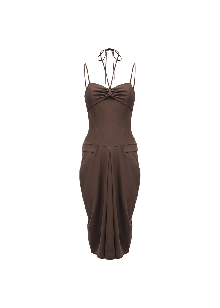 Sleek and bold, this Bralette Dress is a knee-length piece with spaghetti straps hang on the shoulder and self-ties on the neck. Features a build-in corset with a drop-waist draped skirt. This dress reflecting the minimalist ideas of timeless silhouette. Knee-length dress