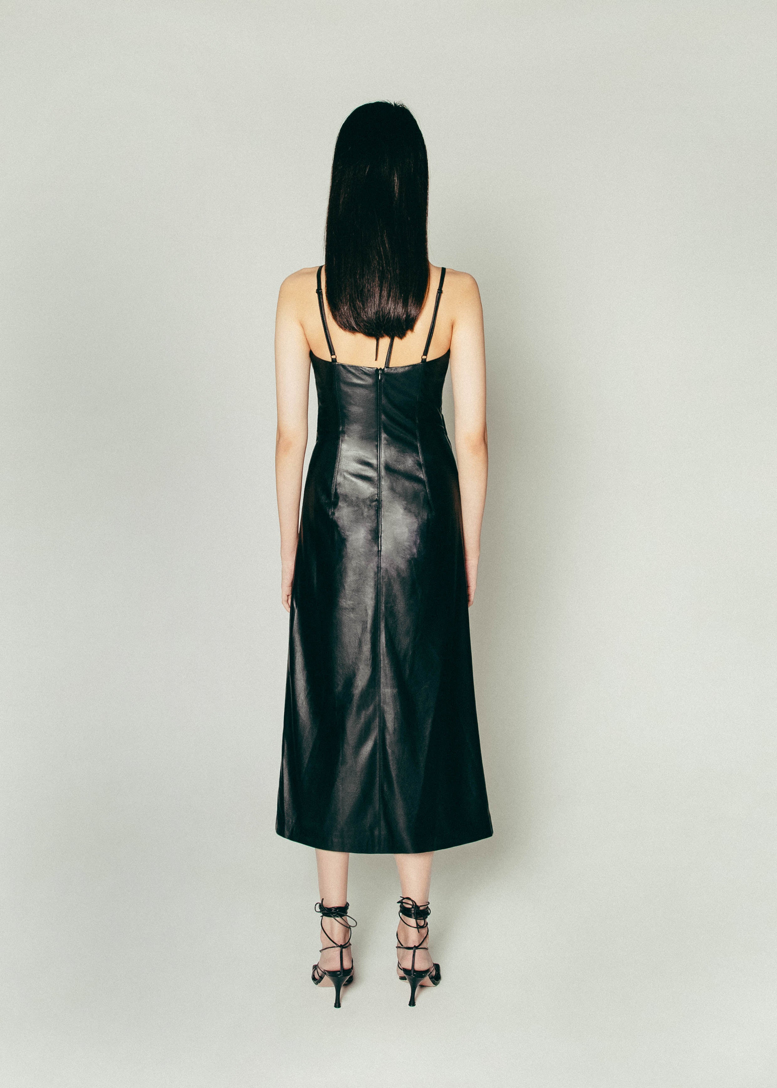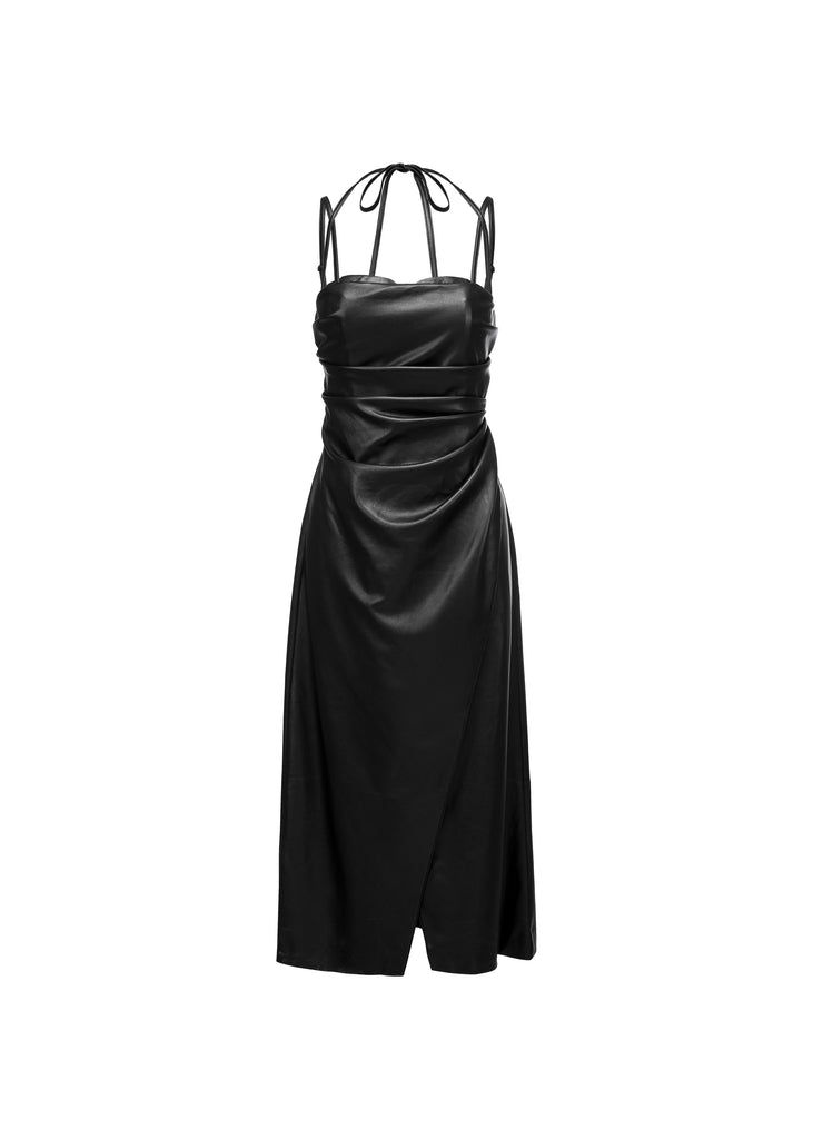 Cut from soft faux leather, the Draped Bustier Dress embrace the aesthetic language of daywear and evening wear. Features a build-in corset with a fluid gathered detail at the waist. Suspended by adjustable shoulder straps and neck straps, this dress traces the new idea of sophisticated allure.