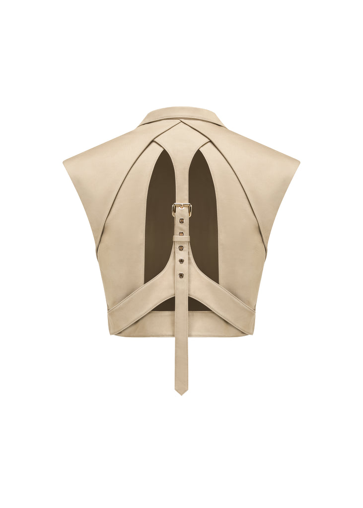The 3-Buttons cropped top has a distinctive style that borrows elements from tailoring. It's cut for a close fit and has a cut-out detailing at the back with adjustable strap. Complete the total outfit with the Mini Skirt Trousers.